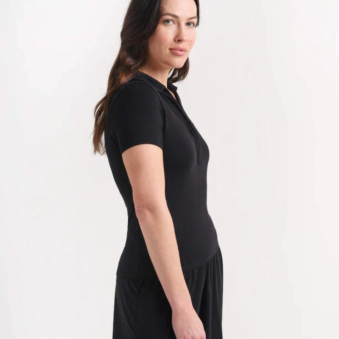 For impeccable style both on and off the course, reach for the ODESSA polo. Featuring a flattering drop v-neck design with hidden snaps, the style is crafted for a slim fit that perfectly skims and flatters the body
